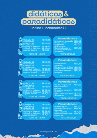 ENSINOFUNDAMENTALII6%u00baano6%u00baanodid%u00e1ticos ¶did%u00e1ticosEnsino Fundamental IISonhos em amareloPoesia visualExpedi%u00e7%u00e3oGal%u00e1pagosDetetive Zack e omist%u00e9rio do chap%u00e9uvermelhoR$ 32,40R$ 65,90R$ 32,00R$ 39,00Paradid%u00e1ticos7%u00baano7%u00baanoSalva%u00e7%u00e3o nofaroesteMang%u00e1 MetamorfoseDroga da obedi%u00eanciaO mist%u00e9rio da salasecretaR$ 33,20R$ 88,90R$ 88,90R$ 54,90Paradid%u00e1ticoscat%u00e1logo 2026 | 108%u00baano8%u00baanoRio de sangue e deamor e outroscontosS%u00f3crates: o garotocuriosoEles criam em DeusQuissamaR$ 33,00R$ 39,00R$ 35,00R$ 62,90Paradid%u00e1ticosCole%u00e7%u00e3o SIE -1%u00ba semestreCole%u00e7%u00e3o SIE -2%u00ba semestreSIE L%u00edngua InglesaSIE Ensino ReligiosoAgenda JovemR$ 519,00R$ 519,00R$ 188,00R$ 169,00R$ 39,00Cole%u00e7%u00e3o SIE -1%u00ba semestreCole%u00e7%u00e3o SIE -2%u00ba semestreSIE L%u00edngua InglesaSIE Ensino ReligiosoAgenda JovemR$ 519,00R$ 519,00R$ 188,00R$ 169,00R$ 39,009%u00baano9%u00baanoProjeto %u00e1guiaO menino do pijamalistradoA descobertaPara gostar de ler -Poesia v.6R$ 57,00R$ 62,90R$ 45,00R$ 68,90Cole%u00e7%u00e3o SIE - Paradid%u00e1ticos1%u00ba semestreCole%u00e7%u00e3o SIE -2%u00ba semestreSIE L%u00edngua InglesaSIE Ensino ReligiosoAgenda JovemR$ 519,00R$ 519,00R$ 188,00R$ 169,00R$ 39,00TOTAL R$ 1434,00 TOTAL R$ 169,30TOTAL R$ 265,90TOTAL R$ 1434,00Cole%u00e7%u00e3o SIE -1%u00ba semestreCole%u00e7%u00e3o SIE -2%u00ba semestreSIE L%u00edngua InglesaSIE Ensino ReligiosoAgenda JovemR$ 519,00R$ 519,00R$ 188,00R$ 169,00R$ 39,00TOTAL R$ 1434,00TOTAL R$ 1434,00TOTAL R$ 169,90TOTAL R$ 233,80
