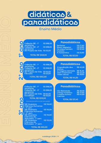 1%u00baano1%u00baanodid%u00e1ticos ¶did%u00e1ticosEnsino M%u00e9dioSenhoraNavio negreiroOs anjos contamhist%u00f3riaA moreninhaR$ 27,60R$ 53,90R$ 52,60R$ 22,90Paradid%u00e1ticos2%u00baano2%u00baanoA revolu%u00e7%u00e3o dosbichosA megera domadaDom CasmurroVidas secasR$ 40,90R$ 18,30R$ 42,20R$ 39,90Paradid%u00e1ticoscat%u00e1logo 2026 | 113%u00baano3%u00baanoS%u00e3o BernardoV%u00e1rias hist%u00f3riasCoral e outrospoemasR$ 38,80R$ 33,80R$ 64,80Paradid%u00e1ticosCole%u00e7%u00e3o SIE - 1%u00basemestreCole%u00e7%u00e3o SIE - 2%u00basemestreSIE Projeto de VidaR$ 598,00R$ 598,00R$ 53,00Cole%u00e7%u00e3o SIE - 1%u00basemestreCole%u00e7%u00e3o SIE - 2%u00basemestreSIE Projeto de VidaFilosofiaR$ 598,00R$ 598,00R$ 53,00R$ 53,00Cole%u00e7%u00e3o SIE - 1%u00basemestreCole%u00e7%u00e3o SIE - 2%u00basemestreSIE Projeto de VidaSociologiaR$ 598,00R$ 598,00R$ 64,00R$ 53,00ENSINOM%u00c9DIOSIE Itiner%u00e1rioCi%u00eancias Humanas- 1%u00ba sem.SIE Itiner%u00e1rioCi%u00eancias Humanas- 2%u00ba sem.SIE Itiner%u00e1rioCi%u00eancias daNatureza - 1%u00ba sem.SIE Itiner%u00e1rioCi%u00eancias daNatureza - 2%u00ba sem.R$ 115,00R$ 115,00R$ 115,00R$ 115,00(o estudante escolhe uma das duas op%u00e7%u00f5es)TOTAL R$ 1249,00TOTAL R$ 1302,00TOTAL R$ 1313,00TOTAL R$ 230,00TOTAL R$ 157,00TOTAL R$ 141,30TOTAL R$ 137,40