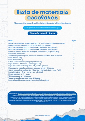 Balde com alfabeto m%u00f3vel de pl%u00e1stico %u2013 Letras mai%u00fasculas e numeraisApontador com dep%u00f3sito (para l%u00e1pis Jumbo %u2013 grosso)Bloco de desenho branco, tamanho A3, 50 folhas, 140 gramasBloco de desenho branco, tamanho A4, 20 folhas, 140 gramasBloco de Papel Creative Lumi Paper, tamanho A4, 20 folhas, 80gBorracha Branca TKAvental de pl%u00e1stico para pintura ou camisa adulto P (sem estampa)Cola Bast%u00e3o 40 gCola Branca 110 gEstojo sem divis%u00f3rias (n%u00e3o faz parte do kit)L%u00e1pis de Cor %u2013 12 cores %u2013 Jumbo (grosso)L%u00e1pis de escrever triangular %u2013 2B, Jumbo (grosso)Massa para modelar at%u00f3xica %u00e0 base de amido %u2013 12 coresGiz de cera ultra resistente %u2013 12 cores %u2013 Jumbo (n%u00e3o %u00e9 o meu 1%u00ba giz)Pasta New Line %u2013 fina %u2013 tamanho A4, CristalPincel escolar n%u00ba 14 %u2013 chatoT%u00eampera guache %u2013 06 coresTesoura escolar sem ponta ambidestraPacote Papel Branco, tamanho A4, 100 folhas, 140glista de materiaisescolarescat%u00e1logo 2026 | 13Alvorada, Canudos, Erechim, Esteio, Gravata%u00ed e Novo Hamburgo.Kit dispon%u00edvel enquanto durarem os estoquesITEM QTD1111121221223111111Educa%u00e7%u00e3o Infantil - 4 anosEDUCA%u00c7%u00c3OINFANTILIMPORTANTE: Os itens de materiais listados est%u00e3o dispon%u00edveis no nosso kit de materiais. Vale ressaltarque o kit n%u00e3o inclui mochila, estojo e lancheira. Para consultar os valores, visite nossa loja.No decorrer do ano letivo pode ser solicitado algum material em desuso, como revistas, pratos deisopor, acess%u00f3rios de armarinho como bot%u00f5es, mi%u00e7angas, l%u00e3, retalhos, tela e outros para odesensenvolvimento de situa%u00e7%u00f5es de aprendizagem espec%u00edfica da turma. TODOS OS MATERIAIS DEVEMSER IDENTIFICADOS.