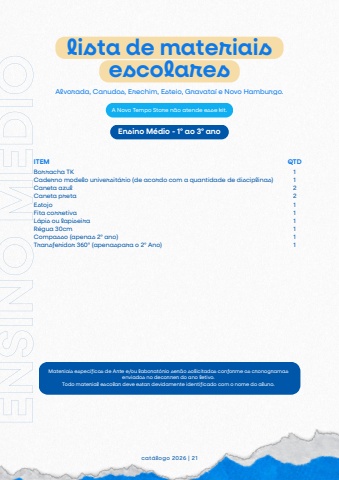 Borracha TKCaderno modelo universit%u00e1rio (de acordo com a quantidade de disciplinas)Caneta azulCaneta pretaEstojoFita corretivaL%u00e1pis ou lapiseiraR%u00e9gua 30cmCompasso (apenas 2%u00ba ano)Transferidor 360%u00ba (apenaspara o 2%u00ba Ano)lista de materiaisescolarescat%u00e1logo 2026 | 21Alvorada, Canudos, Erechim, Esteio, Gravata%u00ed e Novo Hamburgo.ITEM QTD1122111111Ensino M%u00e9dio - 1%u00ba ao 3%u00ba anoENSINOM%u00c9DIOA Novo Tempo Store n%u00e3o atende esse kit.Materiais espec%u00edficos de Arte e/ou laborat%u00f3rio ser%u00e3o solicitados conforme os cronogramasenviados no decorrer do ano letivo.Todo material escolar deve estar devidamente identificado com o nome do aluno.