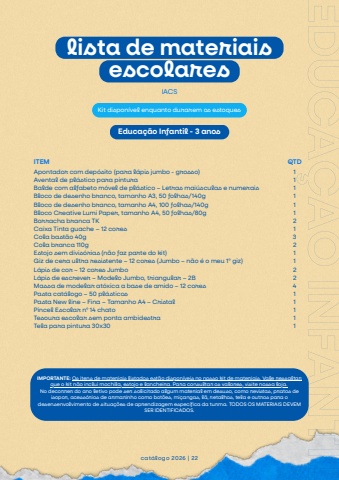 Apontador com dep%u00f3sito (para l%u00e1pis jumbo - grosso)Avental de pl%u00e1stico para pinturaBalde com alfabeto m%u00f3vel de pl%u00e1stico %u2013 Letras mai%u00fasculas e numeraisBloco de desenho branco, tamanho A3, 50 folhas/140gBloco de desenho branco, tamanho A4, 100 folhas/140gBloco Creative Lumi Paper, tamanho A4, 50 folhas/80gBorracha branca TKCaixa Tinta guache %u2013 12 coresCola bast%u00e3o 40gCola branca 110gEstojo sem divis%u00f3rias (n%u00e3o faz parte do kit)Giz de cera ultra resistente %u2013 12 cores (Jumbo %u2013 n%u00e3o %u00e9 o meu 1%u00ba giz)L%u00e1pis de cor %u2013 12 cores JumboL%u00e1pis de escrever %u2013 Modelo Jumbo, triangular %u2013 2BMassa de modelar at%u00f3xica a base de amido %u2013 12 coresPasta cat%u00e1logo %u2013 50 pl%u00e1sticosPasta New line %u2013 Fina %u2013 Tamanho A4 %u2013 CristalPincel Escolar n%u00ba 14 chatoTesoura escolar sem ponta ambidestraTela para pintura 30x30lista de materiaisescolarescat%u00e1logo 2026 | 22IACSITEM QTDEDUCA%u00c7%u00c3OINFANTIL11111121321122411111Educa%u00e7%u00e3o Infantil - 3 anosIMPORTANTE: Os itens de materiais listados est%u00e3o dispon%u00edveis no nosso kit de materiais. Vale ressaltarque o kit n%u00e3o inclui mochila, estojo e lancheira. Para consultar os valores, visite nossa loja.No decorrer do ano letivo pode ser solicitado algum material em desuso, como revistas, pratos deisopor, acess%u00f3rios de armarinho como bot%u00f5es, mi%u00e7angas, l%u00e3, retalhos, tela e outros para odesensenvolvimento de situa%u00e7%u00f5es de aprendizagem espec%u00edfica da turma. TODOS OS MATERIAIS DEVEMSER IDENTIFICADOS.Kit dispon%u00edvel enquanto durarem os estoques