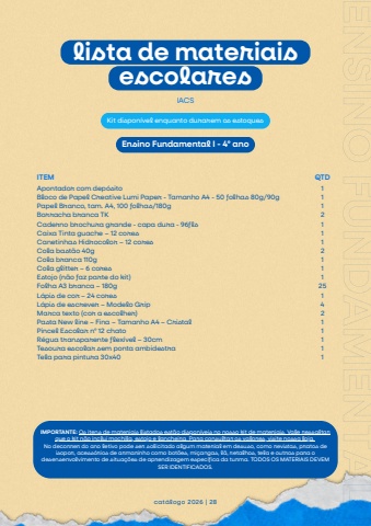 Apontador com dep%u00f3sitoBloco de Papel Creative Lumi Paper - Tamanho A4 - 50 folhas 80g/90gPapel Branco, tam. A4, 100 folhas/180gBorracha branca TKCaderno brochura grande - capa dura - 96flsCaixa Tinta guache %u2013 12 coresCanetinhas Hidrocolor %u2013 12 coresCola bast%u00e3o 40gCola branca 110gCola glitter %u2013 6 coresEstojo (n%u00e3o faz parte do kit)Folha A3 branca %u2013 180gL%u00e1pis de cor %u2013 24 coresL%u00e1pis de escrever %u2013 Modelo GripMarca texto (cor a escolher)Pasta New line %u2013 Fina %u2013 Tamanho A4 %u2013 CristalPincel Escolar n%u00ba 12 chatoR%u00e9gua transparente flex%u00edvel %u2013 30cmTesoura escolar sem ponta ambidestraTela para pintura 30x40cat%u00e1logo 2026 | 28IACSITEM QTD111211121112514211111Ensino Fundamental I - 4%u00ba anoENSINOFUNDAMENTALIIMPORTANTE: Os itens de materiais listados est%u00e3o dispon%u00edveis no nosso kit de materiais. Vale ressaltarque o kit n%u00e3o inclui mochila, estojo e lancheira. Para consultar os valores, visite nossa loja.No decorrer do ano letivo pode ser solicitado algum material em desuso, como revistas, pratos deisopor, acess%u00f3rios de armarinho como bot%u00f5es, mi%u00e7angas, l%u00e3, retalhos, tela e outros para odesensenvolvimento de situa%u00e7%u00f5es de aprendizagem espec%u00edfica da turma. TODOS OS MATERIAIS DEVEMSER IDENTIFICADOS.lista de materiaisescolaresKit dispon%u00edvel enquanto durarem os estoques
