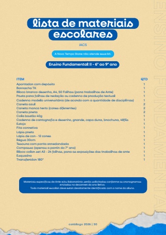 Apontador com dep%u00f3sitoBorracha TKBloco branco desenho, A4, 50 Folhas (para trabalhos de Arte)Pasta para folhas de reda%u00e7%u00e3o ou caderno de produ%u00e7%u00e3o textualCaderno modelo universit%u00e1rio (de acordo com a quantidade de disciplinas)Caneta azulCaneta marca texto (cores diferentes)Caneta pretaCola bast%u00e3o 40gCaderno de cartografia e desenho, grande, capa dura, brochura, 48flsEstojoFita corretivaL%u00e1pis pretoL%u00e1pis de cor - 12 coresR%u00e9gua 30cmTesoura com ponta arredondadaCompasso (apenas a partir do 7%u00ba ano)Bloco color set A3 - 24 folhas, para as exposi%u00e7%u00f5es dos trabalhos de arteEsquadroTransferidor 180%u00bacat%u00e1logo 2026 | 30IACSITEM QTD11111222111111111111Ensino Fundamental II - 6%u00ba ao 9%u00ba anoENSINOFUNDAMENTALIIA Novo Tempo Store n%u00e3o atende esse kit.lista de materiaisescolaresMateriais espec%u00edficos de Arte e/ou laborat%u00f3rio ser%u00e3o solicitados conforme os cronogramasenviados no decorrer do ano letivo.Todo material escolar deve estar devidamente identificado com o nome do aluno.