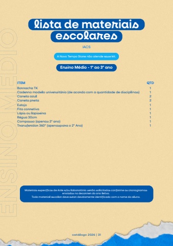 Borracha TKCaderno modelo universit%u00e1rio (de acordo com a quantidade de disciplinas)Caneta azulCaneta pretaEstojoFita corretivaL%u00e1pis ou lapiseiraR%u00e9gua 30cmCompasso (apenas 2%u00ba ano)Transferidor 360%u00ba (apenaspara o 2%u00ba Ano)cat%u00e1logo 2026 | 31IACSITEM QTD1122111111Ensino M%u00e9dio - 1%u00ba ao 3%u00ba anoENSINOM%u00c9DIOA Novo Tempo Store n%u00e3o atende esse kit.lista de materiaisescolaresMateriais espec%u00edficos de Arte e/ou laborat%u00f3rio ser%u00e3o solicitados conforme os cronogramasenviados no decorrer do ano letivo.Todo material escolar deve estar devidamente identificado com o nome do aluno.