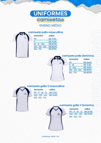 PP - P - M - GGG - 3G - 4G -5G - 6G - 7GR$ 71,90R$ 74,90UNIFORMEScamisetasENSINO M%u00c9DIOcat%u00e1logo 2026 | 04PPPM - G - GG3G - 4G - 5G6G - 7GR$ 71,90R$ 74,90R$ 80,90R$ 86,90R$ 87,90PPP - MG - GG3G - 4G - 5G6G - 7GR$ 66,90R$ 71,90R$ 76,90R$ 81,90R$ 85,90PP - P - M - GGG - 3G - 4G -5G - 6G - 7GR$ 70,90R$ 72,90UNIFORMEScamiseta polo masculinatamanho valorcamiseta polo femininatamanho valorcamiseta gola V masculinatamanho valorcamiseta gola V femininatamanho valor