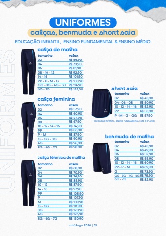 UNIFORMES0204060810 - 12 - 14 - 16PPP - MG - GG - 3G4G5G - 6G - 7GR$ 57,90R$ 60,90R$ 64,90R$ 67,90R$ 74,90R$ 86,90R$ 87,90R$ 90,90R$ 96,90R$ 98,90UNIFORMEScal%u00e7as, bermuda e short saiaEDUCA%u00c7%u00c3O INFANTIL, ENSINO FUNDAMENTAL & ENSINO M%u00c9DIOcat%u00e1logo 2026 | 0502040608 - 10 - 1214 - 16PP - P - M - GGG - 3G - 4G - 5G6G - 7GR$ 56,90R$ 73,90R$ 81,90R$ 92,90R$ 101,90R$ 108,90R$ 114,90R$ 122,900204060810 - 1214 - 16PPPMG - GG3G4G5G - 6G - 7GR$ 68,90R$ 70,90R$ 76,90R$ 85,90R$ 87,90R$ 97,90R$ 105,90R$ 107,90R$ 109,90R$ 111,90R$ 120,90R$ 126,90R$ 130,900204060810 - 12 - 14 - 16PP - P - MGGG - 3G - 4G - 5G6G - 7GR$ 43,90R$ 49,90R$ 52,90R$ 55,90R$ 60,90R$ 69,90R$ 73,90R$ 75,90R$ 82,900204 - 06 - 0810 - 12 - 14 - 16PPP - M - G - GGR$ 43,90R$ 50,90R$ 52,90R$ 53,90R$ 57,90EDUCA%u00c7%u00c3O INFANTIL, ENSINO FUNDAMENTAL I (AT%u00c9 O 5%u00ba ANO)cal%u00e7a de malhatamanho valorshort saiatamanho valorcal%u00e7a femininatamanho valorbermuda de malhatamanho valorcal%u00e7a t%u00e9rmica de malhatamanho valor