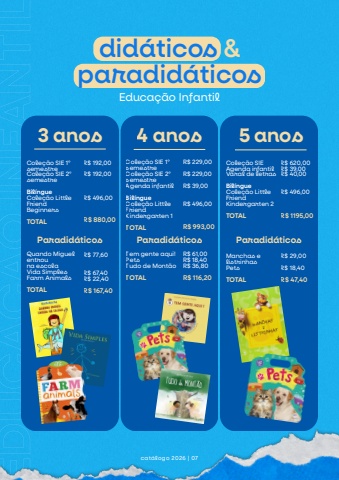 EDUCA%u00c7%u00c3OINFANTIL 3 anosdid%u00e1ticos ¶did%u00e1ticosEduca%u00e7%u00e3o Infantil4 anos 5 anosCole%u00e7%u00e3o SIE 1%u00basemestreCole%u00e7%u00e3o SIE 2%u00basemestreBil%u00edngueCole%u00e7%u00e3o LittleFriendBeginnersTOTALR$ 192,00R$ 192,00R$ 496,00R$ 880,00Paradid%u00e1ticosQuando Miguelentrouna escolaVida SimplesFarm AnimalsTOTALR$ 77,60R$ 67,40R$ 22,40R$ 167,40Cole%u00e7%u00e3o SIE 1%u00basemestreCole%u00e7%u00e3o SIE 2%u00basemestreAgenda infantilBil%u00edngueCole%u00e7%u00e3o LittleFriendKindergarten 1TOTALR$ 229,00R$ 229,00R$ 39,00R$ 496,00R$ 993,00Paradid%u00e1ticosTem gente aqui!PetsTudo de Mont%u00e3oTOTALR$ 61,00R$ 18,40R$ 36,80R$ 116,20Cole%u00e7%u00e3o SIEAgenda infantilVaral de letrasBil%u00edngueCole%u00e7%u00e3o LittleFriendKindergarten 2TOTALR$ 620,00R$ 39,00R$ 40,00R$ 496,00R$ 1195,00Paradid%u00e1ticosManchas elistrinhasPetsTOTALR$ 29,00R$ 18,40R$ 47,40cat%u00e1logo 2026 | 07
