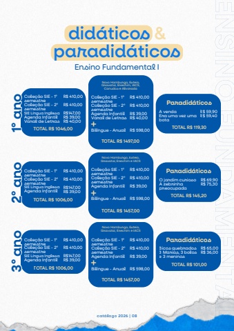 1%u00baano1%u00baanodid%u00e1ticos ¶did%u00e1ticosEnsino Fundamental ICseomlee%u00e7s%u00e3toreSIE - 1%u00ba4 anos Cole%u00e7%u00e3o SIE - 2%u00basemestreSIE L%u00edngua InglesaAgenda InfantilVaral de LetrasR$ 410,00R$ 410,00R$147,00R$ 39,00R$ 40,00cat%u00e1logo 2026 | 08Cole%u00e7%u00e3o SIE - 1%u00basemestreCole%u00e7%u00e3o SIE - 2%u00basemestreAgenda InfantilVaral de LetrasBil%u00edngue - AnualR$ 410,00R$ 410,00R$ 39,00R$ 40,00R$ 598,00A vendaEra uma vez umabotaR$ 59,90R$ 59,40Paradid%u00e1ticos+Novo Hamburgo, Esteio,Gravata%u00ed, Erechim, IACS,Canudos e Alvorada2%u00baano2%u00baanoCole%u00e7%u00e3o SIE - 1%u00ba4 anos semestreCole%u00e7%u00e3o SIE - 2%u00basemestreSIE L%u00edngua InglesaAgenda InfantilR$ 410,00R$ 410,00R$147,00R$ 39,00Cole%u00e7%u00e3o SIE - 1%u00basemestreCole%u00e7%u00e3o SIE - 2%u00basemestreAgenda InfantilBil%u00edngue - AnualR$ 410,00R$ 410,00R$ 39,00R$ 598,00O jardim curiosoA zebrinhapreocupadaR$ 69,90R$ 75,30Paradid%u00e1ticos+Novo Hamburgo, Esteio,Gravata%u00ed, Erechim e IACS3%u00baano3%u00baanoCole%u00e7%u00e3o SIE - 1%u00ba4 anos semestreCole%u00e7%u00e3o SIE - 2%u00basemestreSIE L%u00edngua InglesaAgenda InfantilR$ 410,00R$ 410,00R$147,00R$ 39,00Cole%u00e7%u00e3o SIE - 1%u00basemestreCole%u00e7%u00e3o SIE - 2%u00basemestreAgenda InfantilBil%u00edngue - AnualR$ 410,00R$ 410,00R$ 39,00R$ 598,00Bicos quebrados3 Marias, 3 bolose 3 meninosR$ 65,00R$ 36,00Paradid%u00e1ticos+ENSINOFUNDAMENTALINovo Hamburgo, Esteio,Gravata%u00ed, Erechim e IACSTOTAL R$ 1046,00TOTAL R$ 1497,00TOTAL R$ 119,30TOTAL R$ 1006,00TOTAL R$ 1457,00TOTAL R$ 145,20TOTAL R$ 1006,00TOTAL R$ 1457,00TOTAL R$ 101,00
